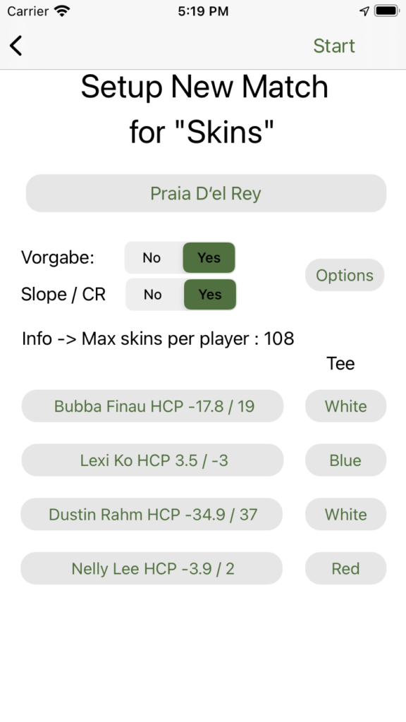 If two or more players each play the best result on one hole, the pot for the next hole increases by the value of the hole just played. Only a single lowest score wins the hole. Whether or not a limit is set for deferred skins should be clarified before the start. Without a limit, it can happen that towards the end of the round a quite high value is in the pot. To guarantee an exciting game, it is recommended to play at least three players. In this way holes are often shared and the excitement increases especially towards the end of the round.