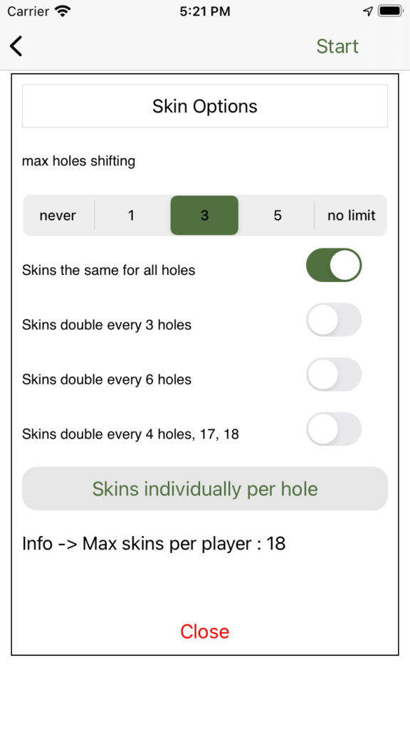 Wird diese Bahn erneut geteilt, geht es am darauf folgenden Loch um 21 Punkte, es sei denn Sie haben zuvor beschlossen, lediglich drei Skins aufschieben zu können. Dann geht es nach wie vor um 15 Punkte. Der wegfallende Skin wird zu gleichen Teilen aufgesplittet. Ob Sie netto oder brutto spielen, bleibt Ihnen überlassen.