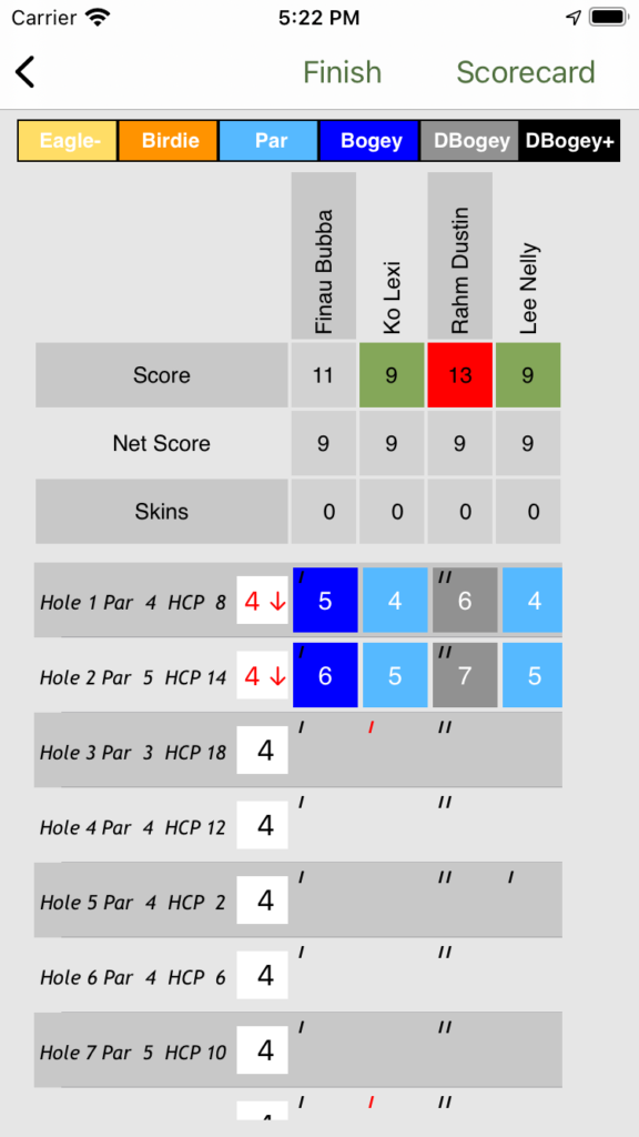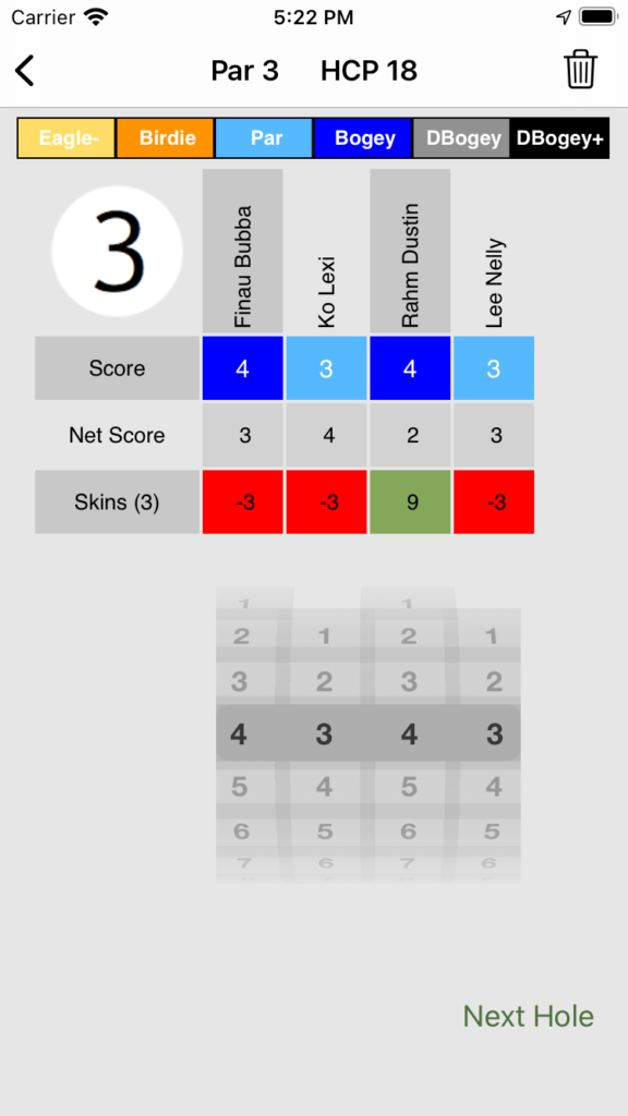 Beispiel: Sie spielen zu dritt und legen für die ersten sechs Bahnen einen Wert von je drei Punkten fest, für die nächsten sechs je sechs Punkte und die abschließenden sechs Löcher einen Wert von jeweils neun Punkten. Damit setzt jeder Mitspieler einen, dann zwei und zuletzt drei Punkte pro Loch in den Topf ein. Die ersten fünf Bahnen gewinnen jeweils unterschiedliche Spieler. Bahnen sechs und sieben werden geteilt. Damit spielen Sie am achten Loch um drei Skins und in diesem Fall um 15 Punkte.
