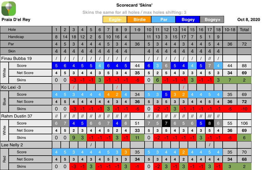 The attraction of the Skins Game is that towards the end of the round you mostly play for increasing points. Even someone who hasn’t played the whole round very well can win a lot with a few good shots at the right time. A game for golfers with strong nerves.