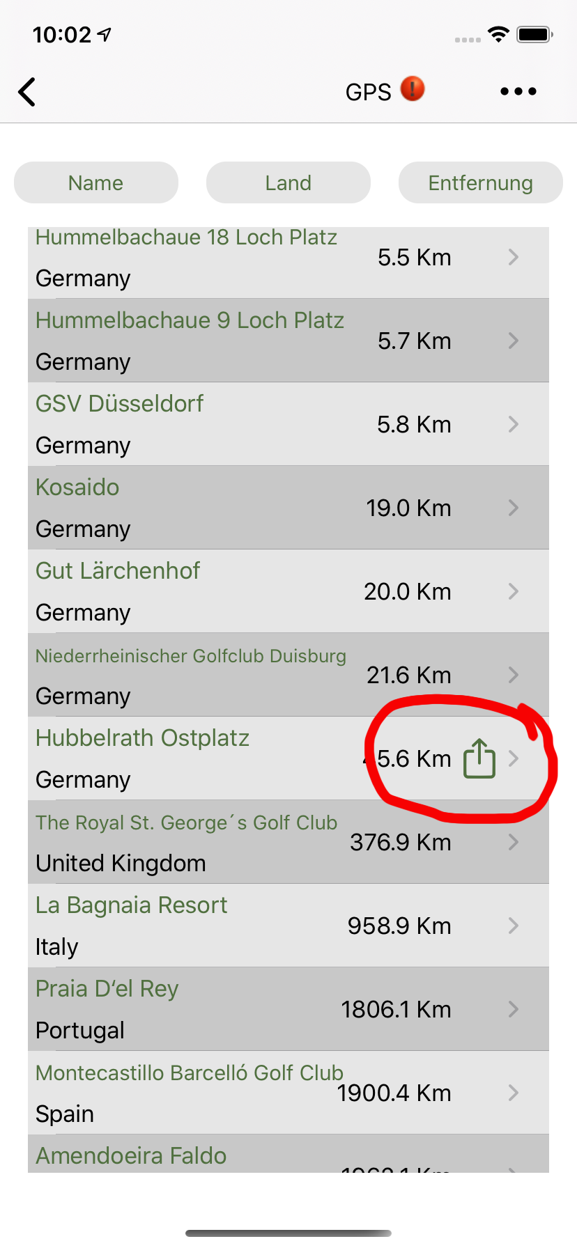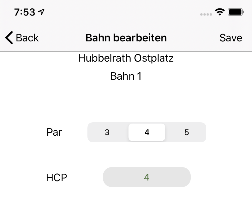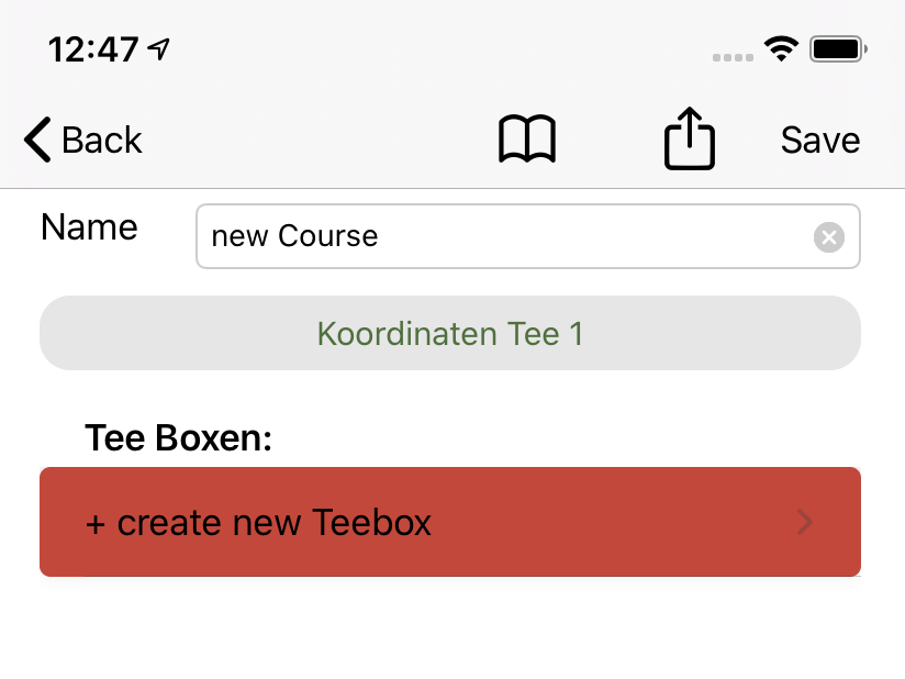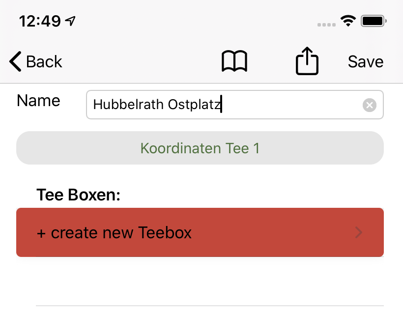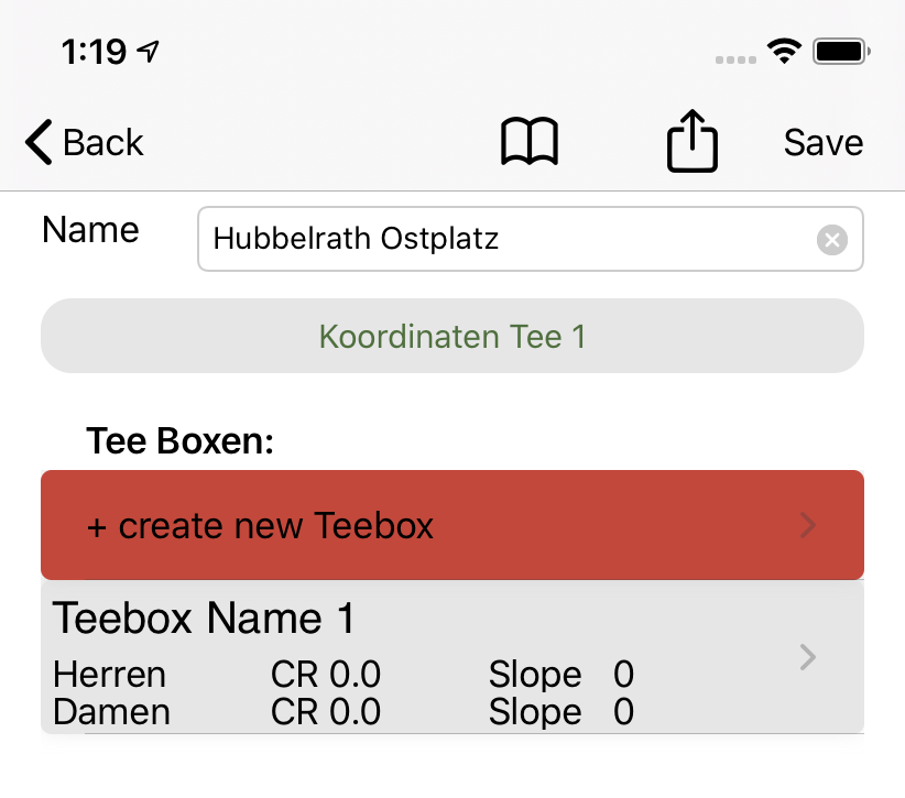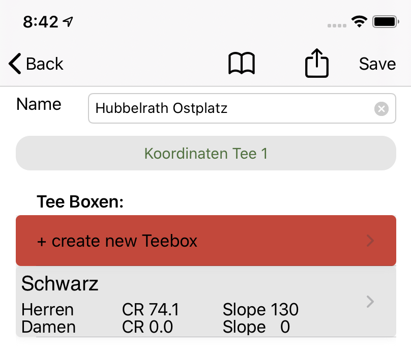 Der einfachste Weg, zu den Koordinaten zu kommen, ist, wenn Du auf dem Golfplatz stehst und auf den Standortpfeil tippst. Dann werden die Koordinaten direkt in die entsprechenden Felder eingetragen.